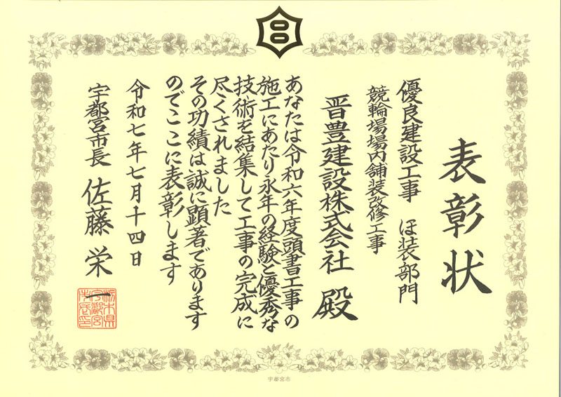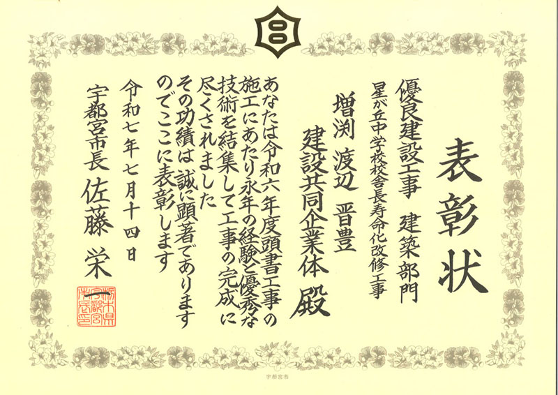 令和6年度宇都宮市優良工事表彰をいただきました。(2工事) これからも地域の発展のために尽力いたします。