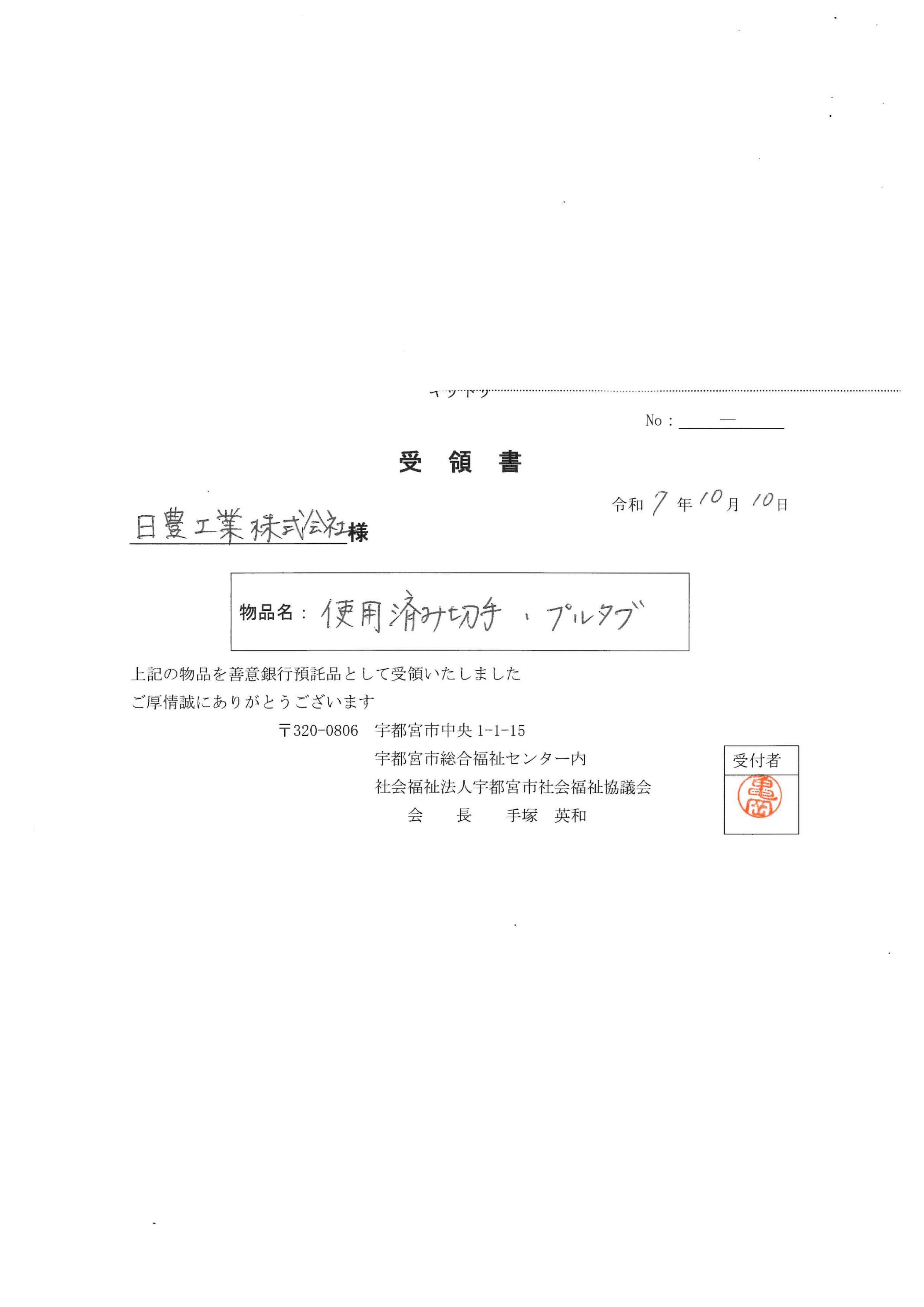 社会福祉法人宇都宮市社会福祉協議会に、使用済み切手・プルタブを預託致しました。