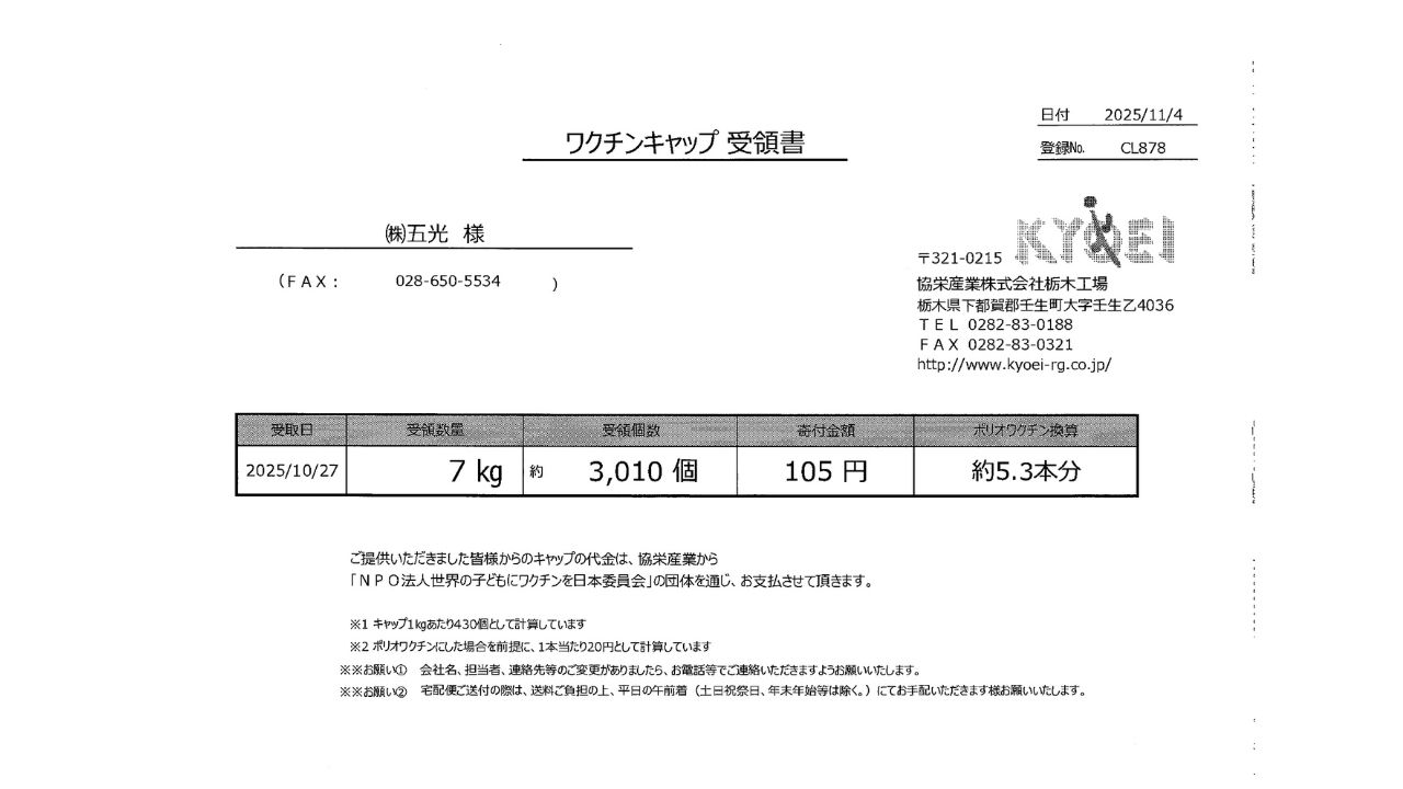 今後も「ワクチンキャップ運動」に参加し、社員全員で力を合わせて活動してまいります!