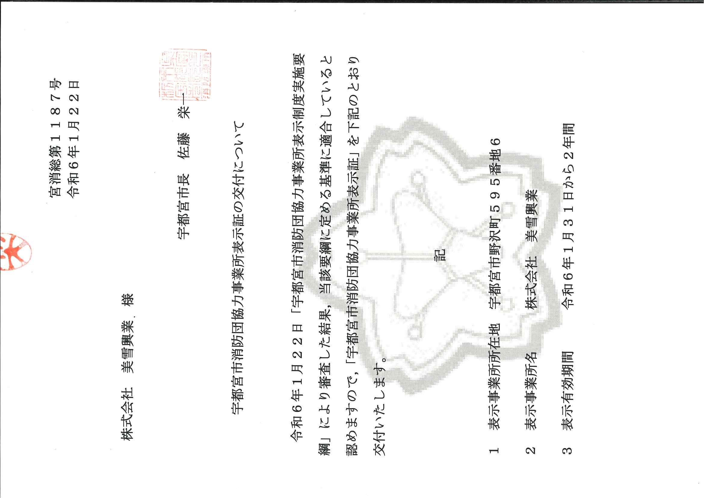 令和8年1月に『宇都宮市消防団協力事業所』の更新を致しました。