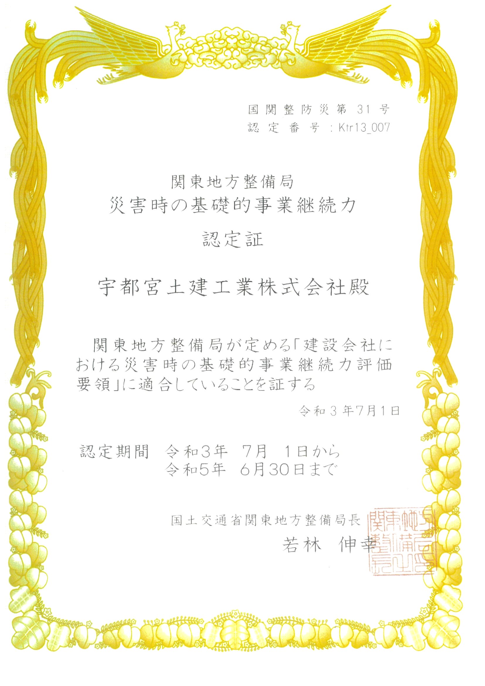 災害時の基礎的事業継続力の認定(2023.06.26)国土交通省関東地方整備局より災害時の基礎的事業継続力の認定を受け建設会社における事業継続計画の策定を促進し、宇都宮市をはじめとする地域防災の向上に貢献しています。 (もっと見る)